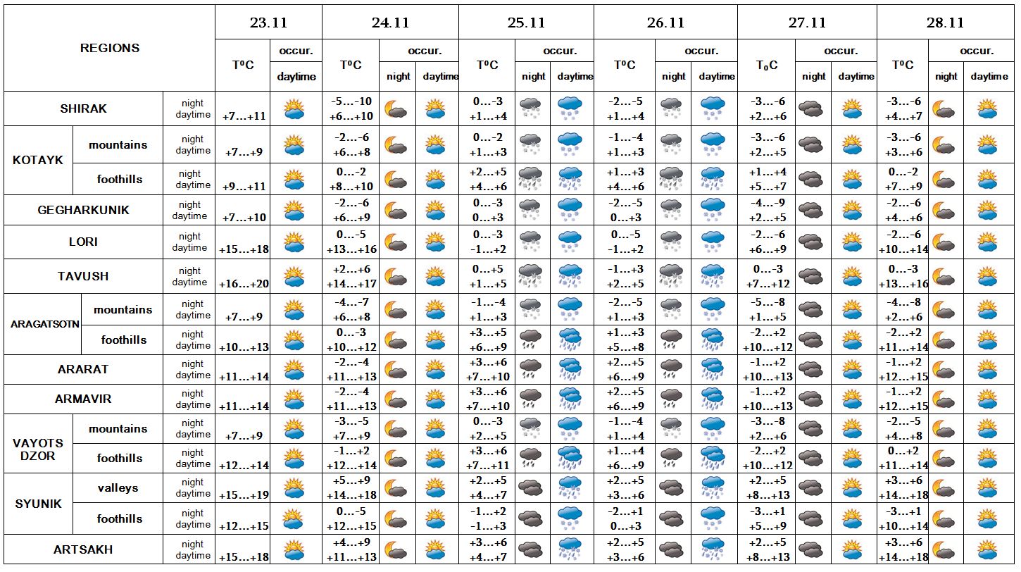 In the daytime of November 23, at night of 24, on 27-28 no precipitation is predicted. In the evening of November of 24 in separate places, on 25-26 in mist regions precipitation is predicted: in the form of snow in mountainous regions and foothills, in separate places fog is predicted.