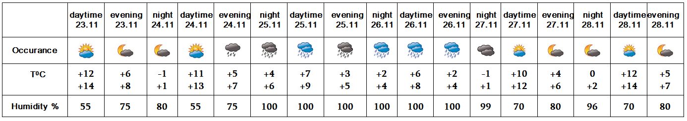 In the daytime of November 23, at night of 24, on 27-28 no precipitation is predicted. In the evening of November 24, on 25-26 rain is predicted.