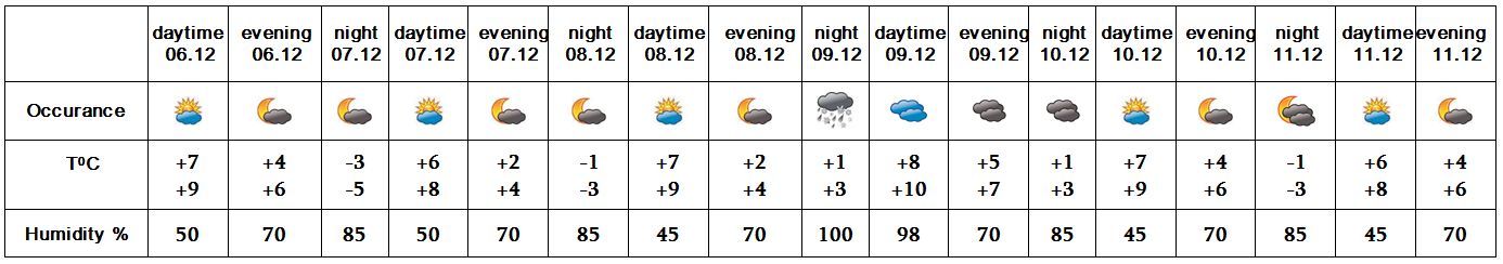 In the daytime of December 6, on 7-8, in the daytime of 9, on 10-11 no precipitation is predicted. At night of December 9 rain is predicted.