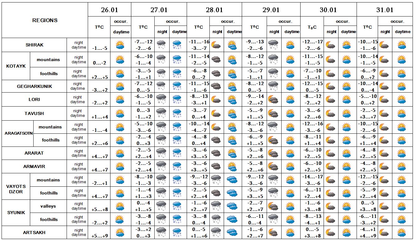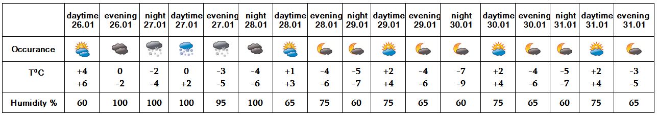 In the daytime of January 26, on 28, in the daytime of 29, on 30-31 no precipitation is predicted. On January 27 in most regions, at night of and in the evening of 28, at night of 29 in sparate places snow and fog is predicted.