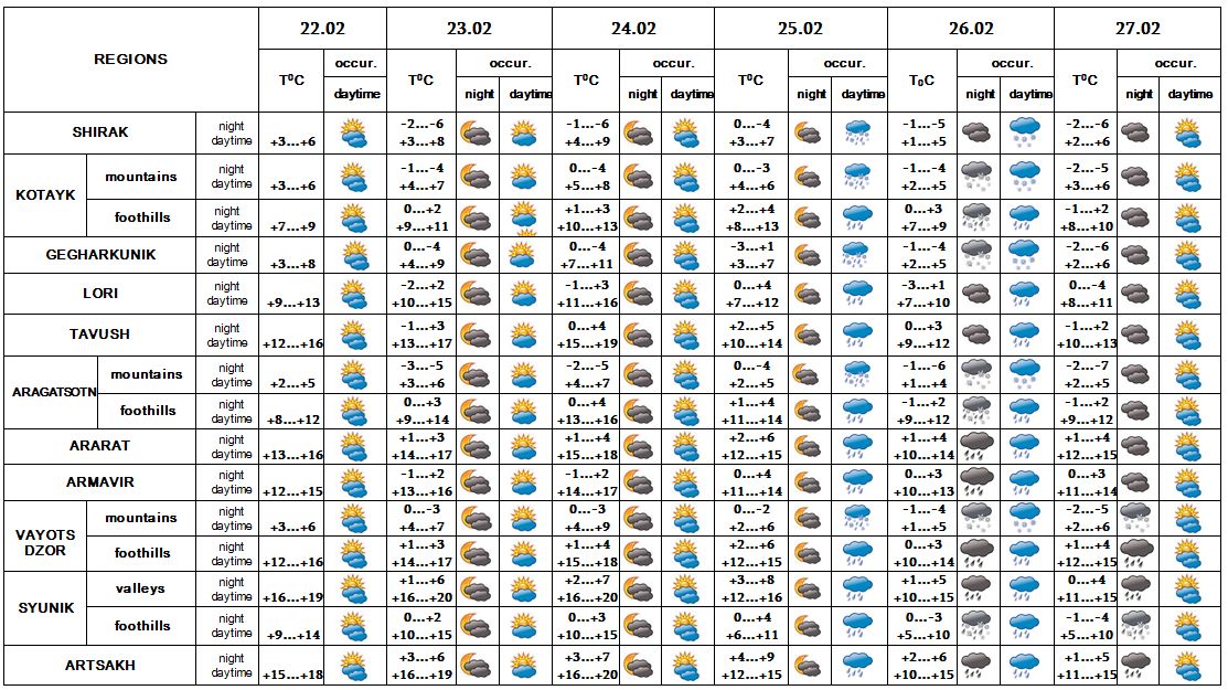 In the daytime of February 22, on 23-24, at night of 25, on 27 no precipitation is predicted. In the daytime of February 25, on 26 in most regions, at night of 27 in separate places precipitation is predicted: in the form of snow in the mountainous regions.