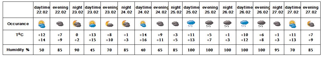 In the daytime of February 22, on 23-24, at night of 25, on 27 no precipitation is predicted. In the daytime of February 25, on 26 rain is predicted.