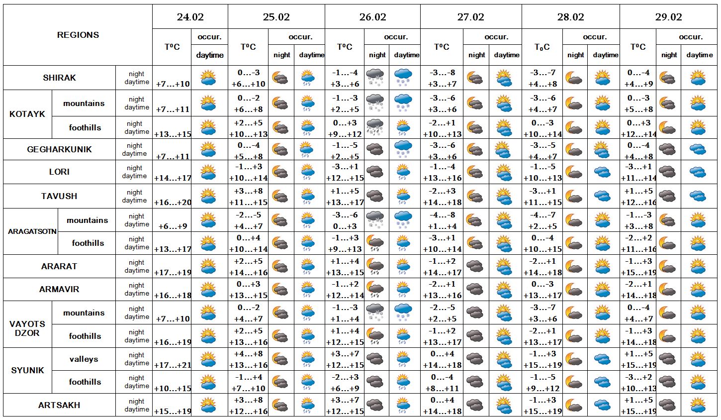 South wind speed is 5-10 m/s, on February 25 in separate places wind speed may reach up to 20-25 m/s.