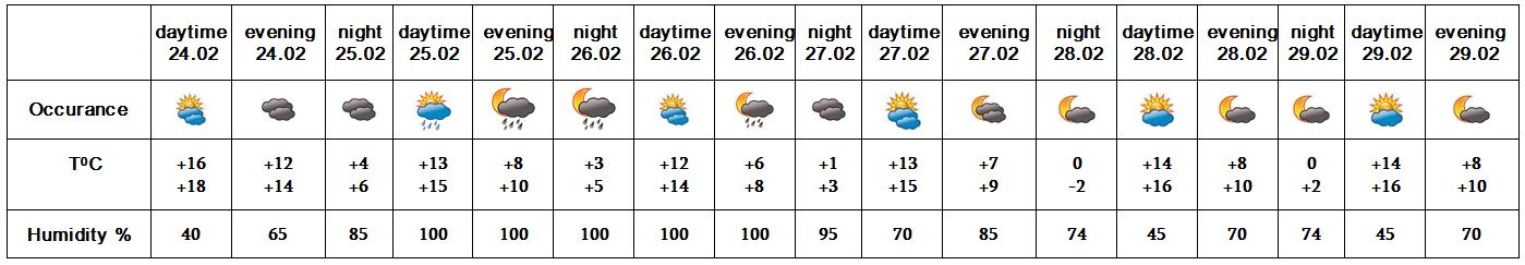 In the daytime of February 24, at night of 25, on 27-28, on March 1 no precipitation is predicted. In the daytime of February 25, on 26 from time to time short-term rain is predicted. On February 25 wind speed may reach up to 15-18 m/s.