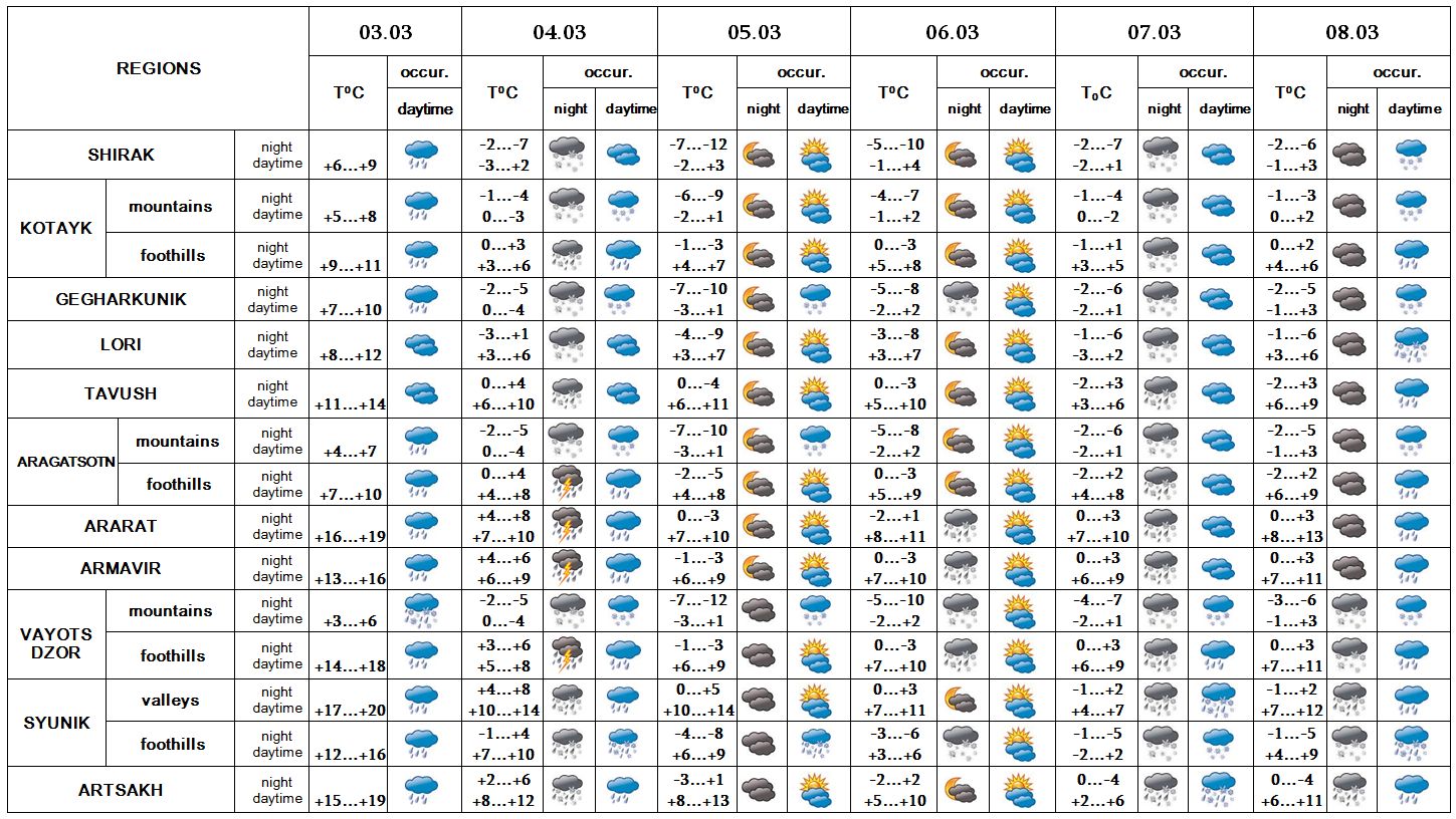 In the daytime of March 3, at night and in the daytime of 4, on 7, in the daytime of 8 from time to time in most regions, in the daytime of 4, in the daytime of 5, at night of 6 in separte places precipitation is predicted: in the mountainous regions in the form of snow, at night of 4 in separte places thunderstorm is possible. At night of March 5, in the daytime of 6 no precipitation is predicted.