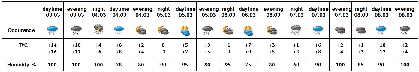 In the daytime of March 3, at night and in the daytime of 4, in the evening of 5, on 7-8, in the afternoon of 4, at night of 5, on 6 no precipitation is predicted. On March 3-4 wind speed may reach up to 14-18 m/s.