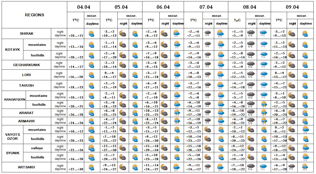 South-west speed is 2-5 m/s, on April 4-6, on 8 in separate regions wind speed may reach up to 18-23 m/s.