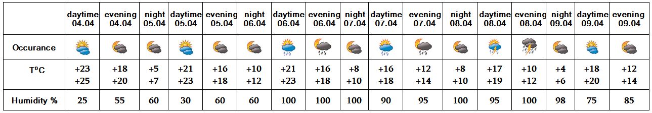In the daytime of April 4, on 5, at night of 6, on 9 no precipitation is predicted. In the daytime of April 6, on 7-8 rain is predicted. On April 4-6, on 8 wind speed may reach up to 14-16 m/s.