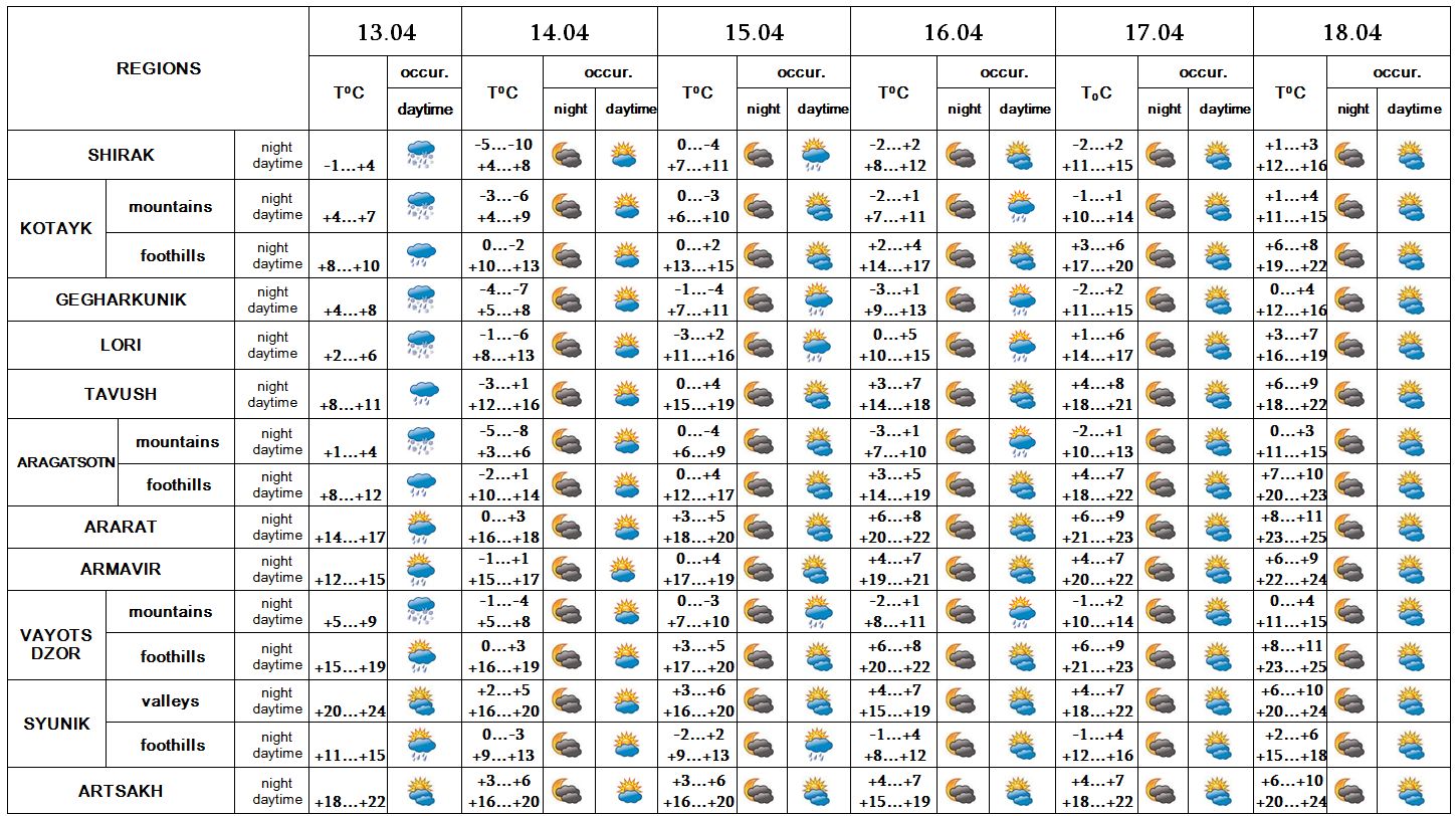 In the daytime of April 13, in the daytime of 15-16 in separate regions precipitation is predicted: on 13 in the form of wet snow and sleet in the mountainous regions. In the daytime of April 14, at night of 15-16, on 17-18 no precipitation is predicted.