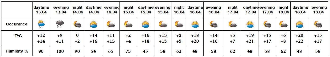 In the daytime of April 13 rain is predicted. On April 14-18 no precipitation is predicted.