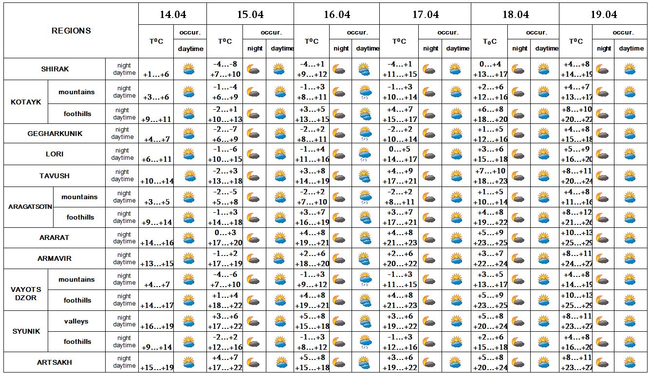 In the daytime of April 14, on 15, at night of 16, on 17-19 no precipitation is predicted. In the daytime of April 16 in separate regions short-tremn rain is predicted.