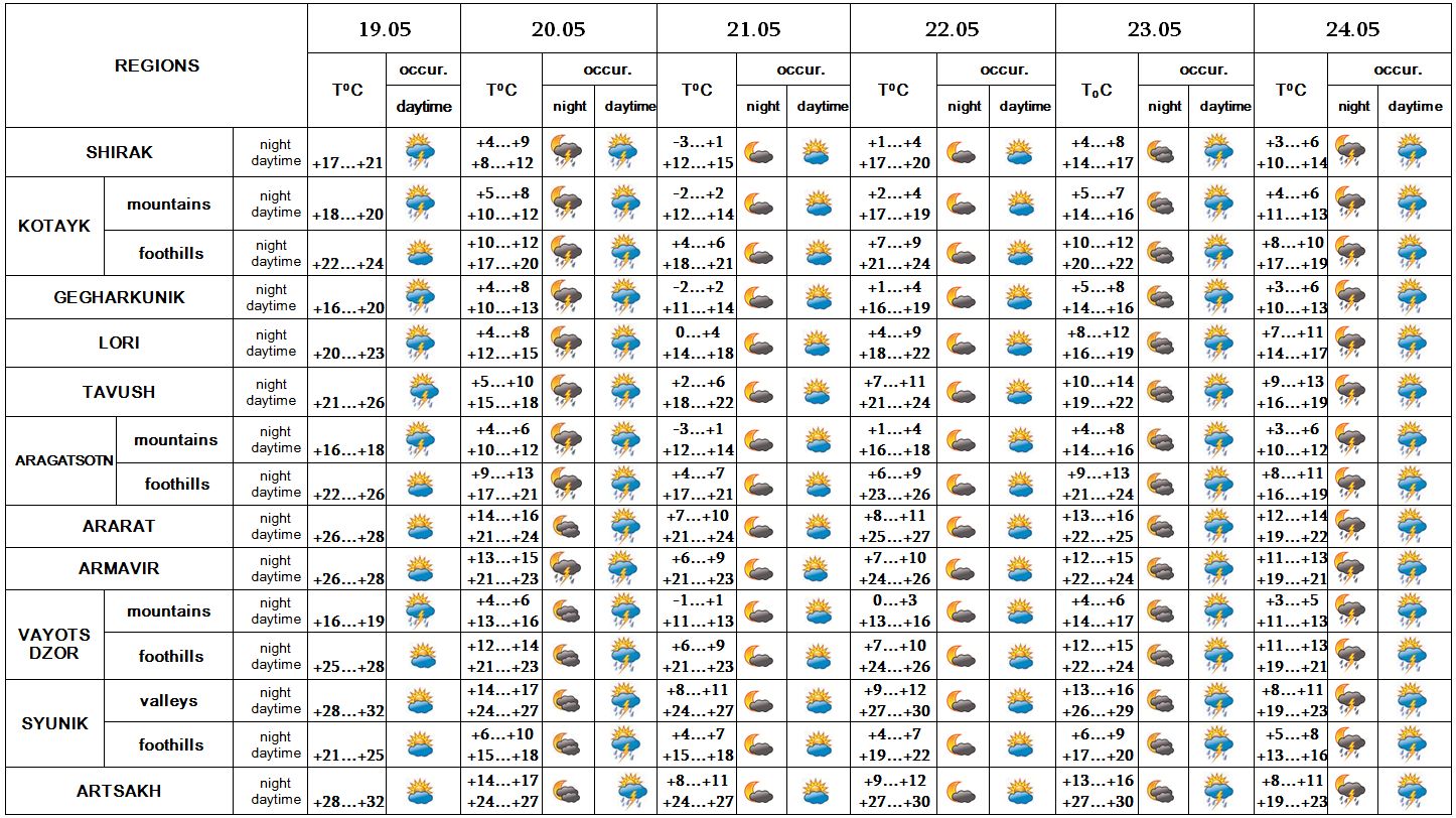 In the afternoon of May 19 in separate regions, on 20, in the afternoon and at night of 23-24 in most regions short-term rain with thunderstorm is predicted, in separate parts hail is possible. On May 21-22 no precipitation is predicted.