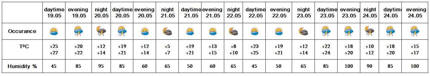 In the evening of May 19, in the afternoon and at night of 20, in the daytime of 23, on 24 from time to time short-term rain with thunderstorm is predicted, during the thunderstorm the wind speed may reach up to 15-18 m/s. On May 21-22 no precipitation is predicted.