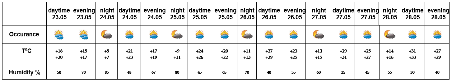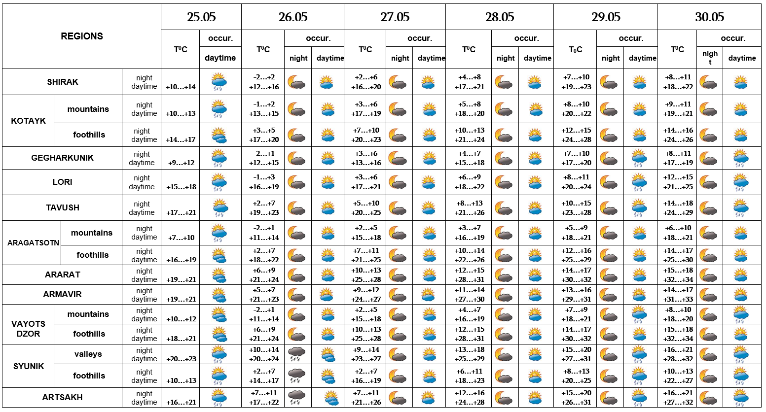 In the daytime of May 25, 29 and 30 in separate regions, at night of 26 in Syunik and Artsakh rain with thunderstorm is predicted. in separate parts hail is possible. In the daytime of May 26, on 27-28 at night of 29-30 no precipitation is predicted.