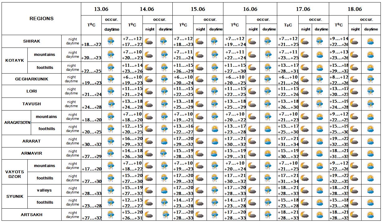 In the afternoon of June 13, at night and in the afternoon 14-16 in most regions, on 17-18 in separate regions short-term rain with thunderstorm is predicted. In separate parts hail is also possible.