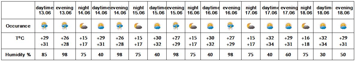 In the afternoon of June 13, at night and in the evening of 14-16 in short-term rain with thunderstorm is predicted, during the thunderstorm the wind speed may reach up to 18-20 m/s. On June 17-18 no precipitation is predicted.