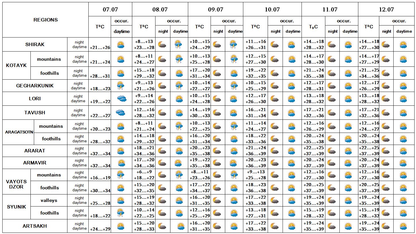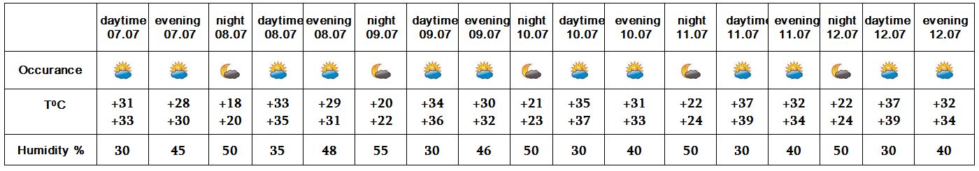 On July 7, in the afteroon of 8-9 in separate regions short-term local short-term rain with thunderstorm is predicted. On July 10-12 no precipitation is predicted.