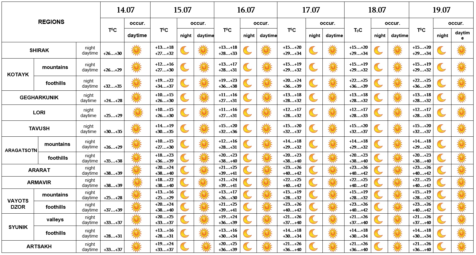 The territory of the Republic continues to be under the influence of tropical hot air flow from the regions of the Arabian Peninsula. In the daytime hours of July 14-19 the air temperature may reach up to +39…+42 in Ararat valley, in the foothills of Aragatsotn, Vayots Dzor Provinces and Yerevan city.