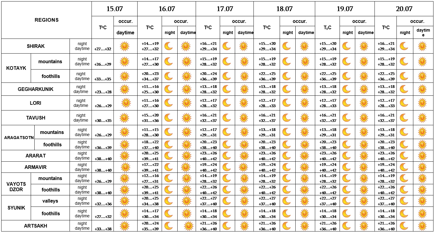 The territory of the Republic continues to be under the influence of tropical hot air flow from the regions of the Arabian Peninsula. In the daytime hours of July 15-20 the air temperature may reach up to +39…+42 in Ararat valley, in the foothills of Aragatsotn, Vayots Dzor Provinces and Yerevan city.