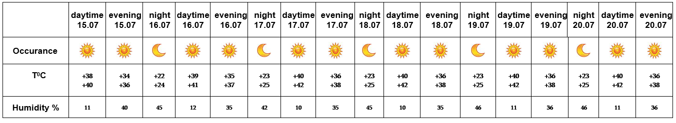 In the daytime of July 15, on 16-20 no precipitation is predicted. In the evening the wind speed may reach up to 10-12 m/s.