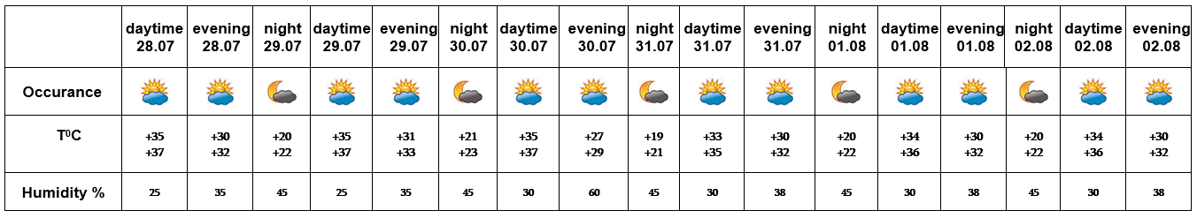 In the daytime of July 28, on 29 no precipitation is predicted. On July 30-31, the afternoon of August 1-2 in separate regions short-term rain with thunderstorm is predicted. On July 28-29 no precipitation is predicted.