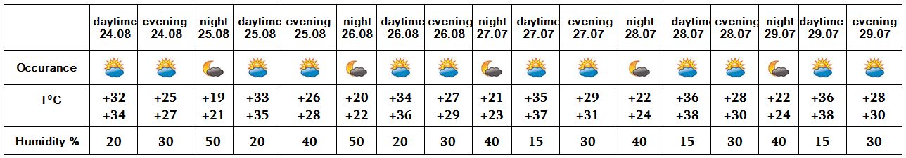 In the daytime of August 24, on 25-29 no precipitation is predicted. In the evening of August 24-25 the wind speed may reach up to 11-13 m/s.