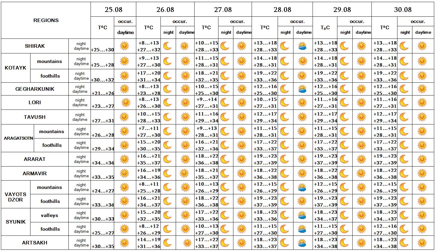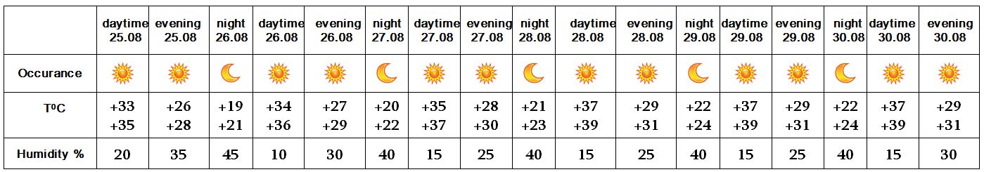 In the daytime of August 25, on 26-30 no precipitation is predicted.
