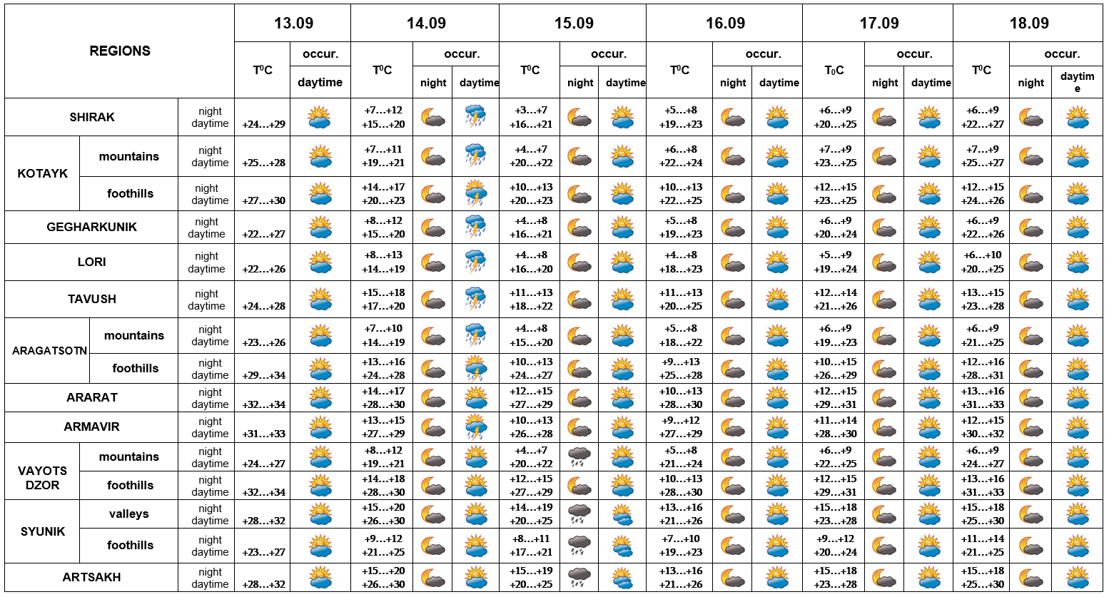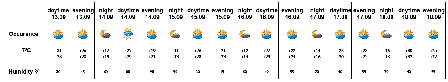 On September 13, on 15-18 no precipitation is predicted. In the afternoon of September 14 short-term rain with thunderstorm is predicted. During the thunderstorm the wind may reach up to 15-19 m/s.