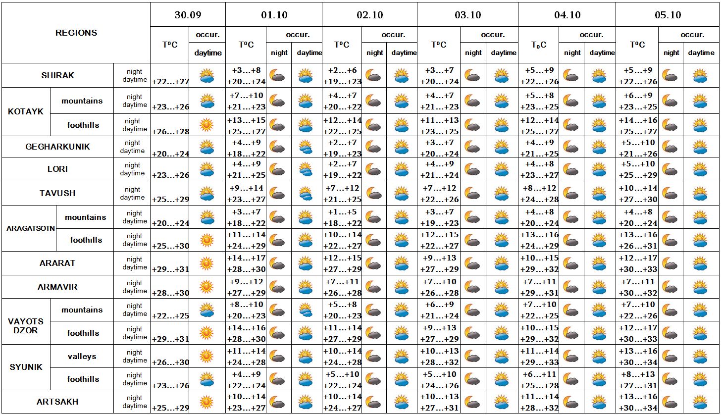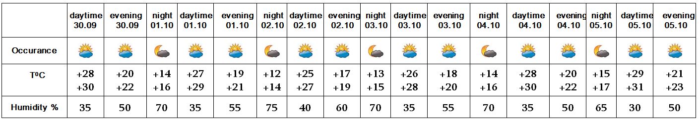 In the daytime of September 30, on October 1-5 no precipitation is predicted.