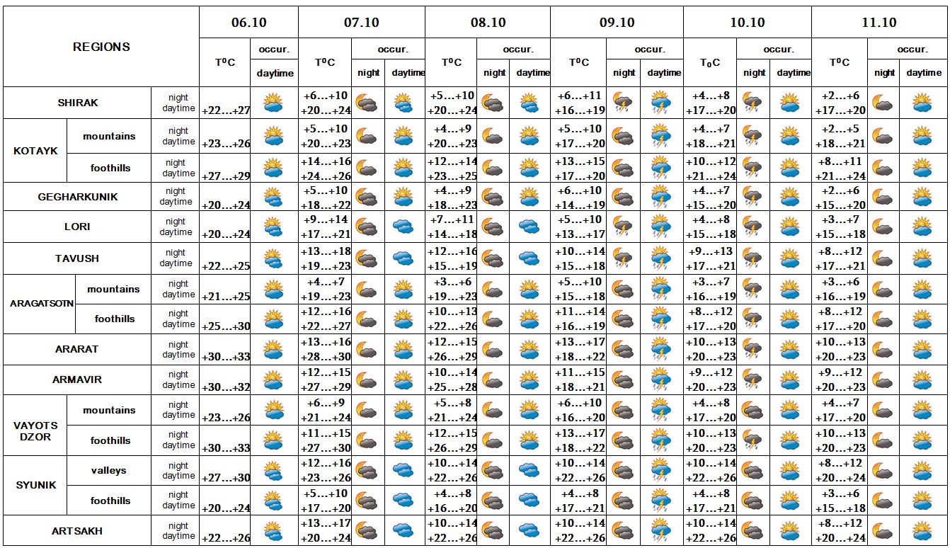 In the daytime of October 6, on 7-8, in the daytime of 10, on 11 no precipitation is predicted. In the marning and daytime of October 9, at night of 10 rain with thunderstorm is predicted, during the thunderstorm the wind may reach up to 15-18 m/s.