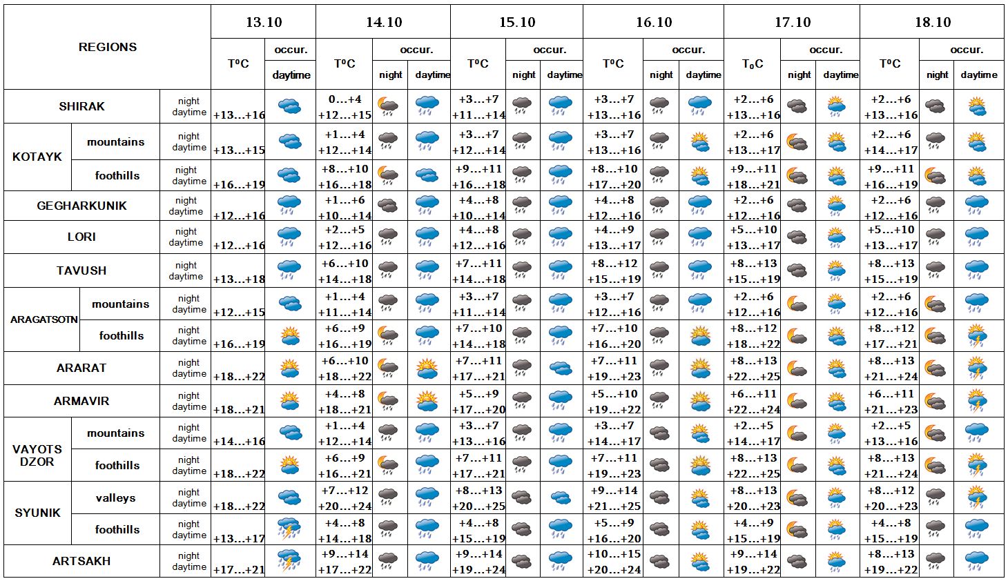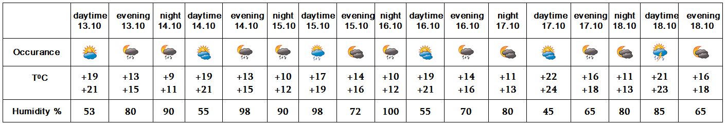 In the daytime of October 13, on 14-18 in separate regions rain is predicted, on 13 and in the daytime of 18 thunderstorm is also possible.