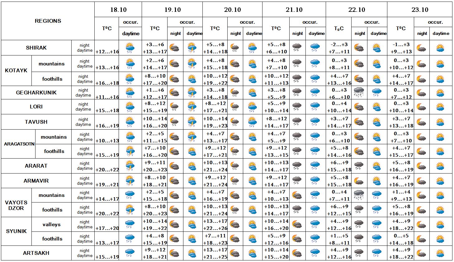 In the daytime of October 18, on 19, at night and in the evening of 18, on 22 in separate regions, in the daytime of 18, on 21 in most regions rain is predicted, on 18-20 in separate regions thunderstorm is also possible. On October 23 no precipitation is predicted.