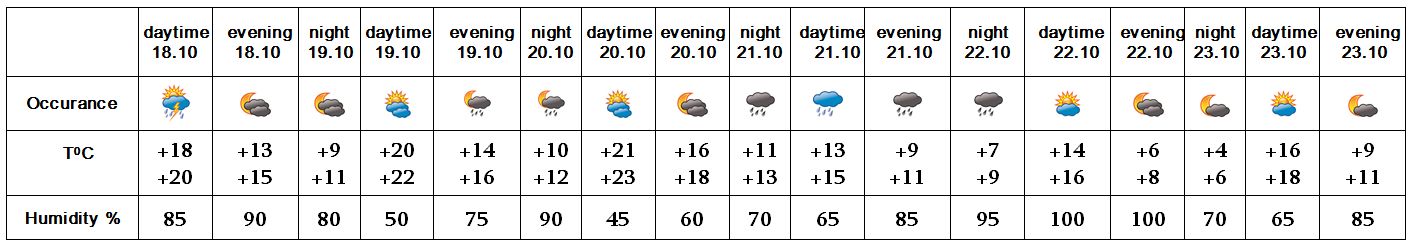 In the daytime of October 18, in the evening of 19, at night of 20 short-term is possible. On October 21, at night of 22 rain is predicted. In the daytime of October 20, on 23 no precipitation is predicted.