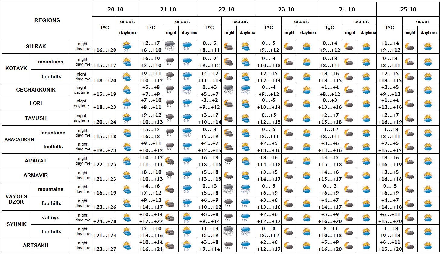 In the evening of October 20, on 22 in separate regions, on 21 in most regions rain is predicted. On 21-22 in separate mountainous regions wet snow is predicted. On October 23-25 no precipitation is predicted.