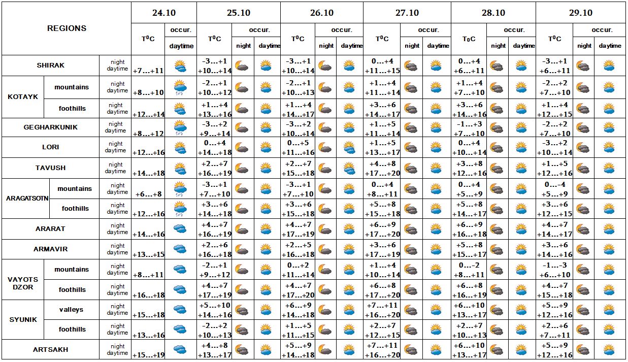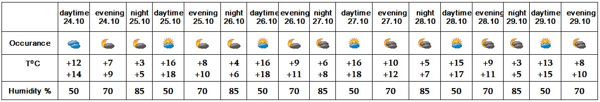 In the daytime of October 24 in separate regions rain is predicted. On October 25-29 no precipitation is predicted.