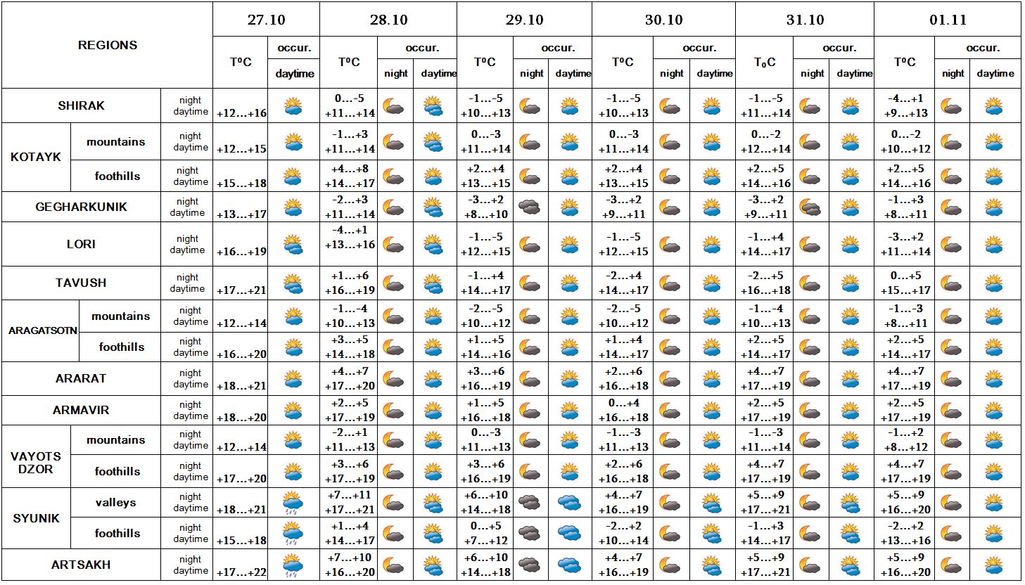 In the daytime of October 27 in Syunik province and Artsakh light rain, in separate regions fog is predicted. On October 28-31, on November 1 no precipitation is predicted.