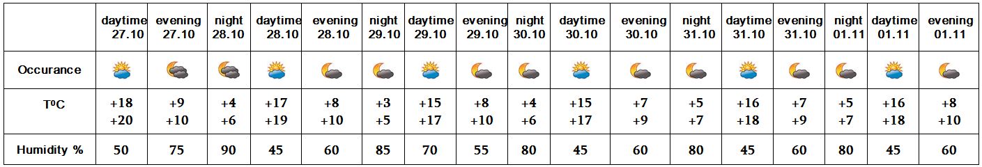 In the daytime of October 27, on 28-31, on November 1 no precipitation is predicted.