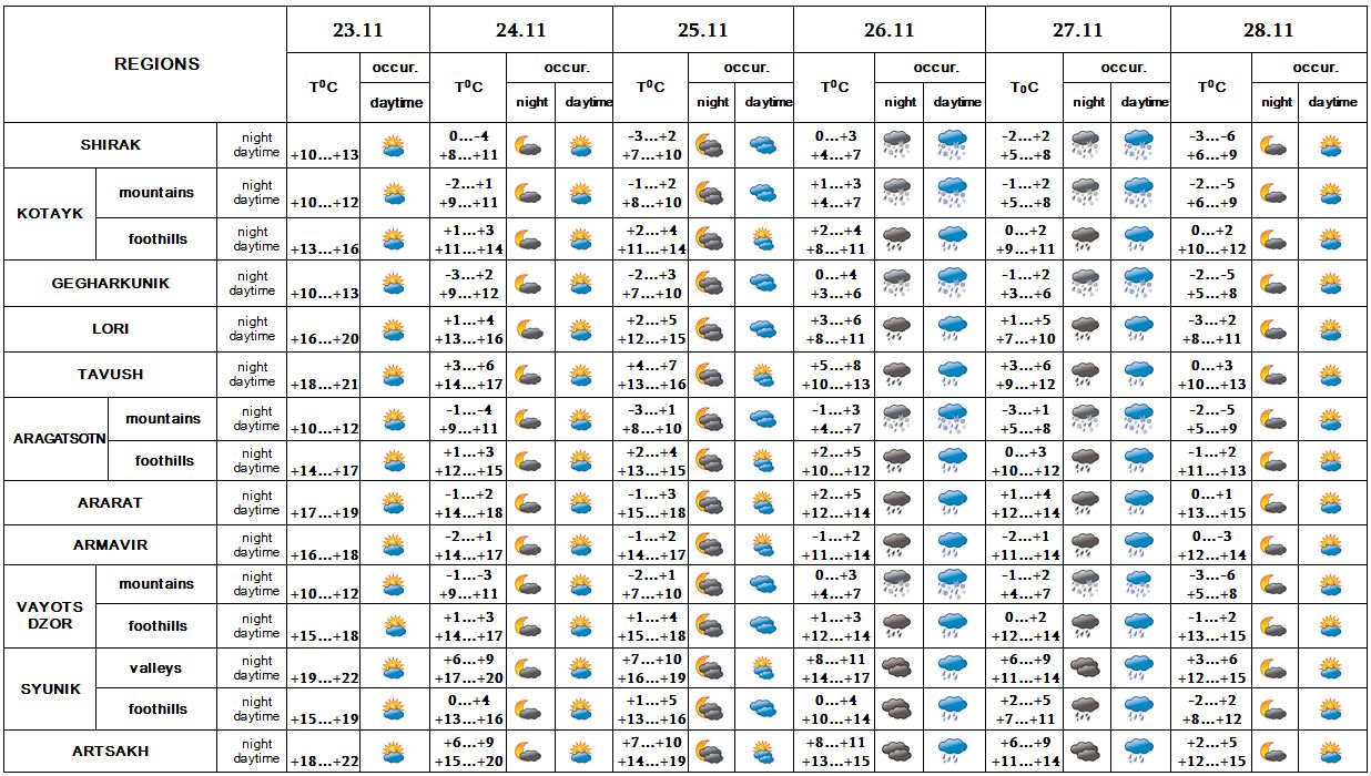In the daytime of November 23, on 24, on 28 no precipitation is predicted. In the evening of November 25, on 26-27 in most regions precipitation is predicted: in mountainous regions in the form of wet snow.