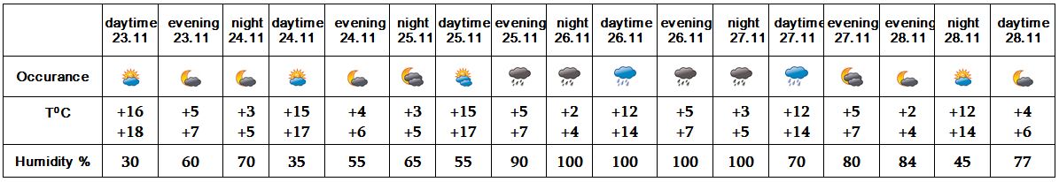 In the daytime of November 23, on 24, on 28 no precipitation is predicted. In the evening of November 25, on 26-27 rain is predicted.