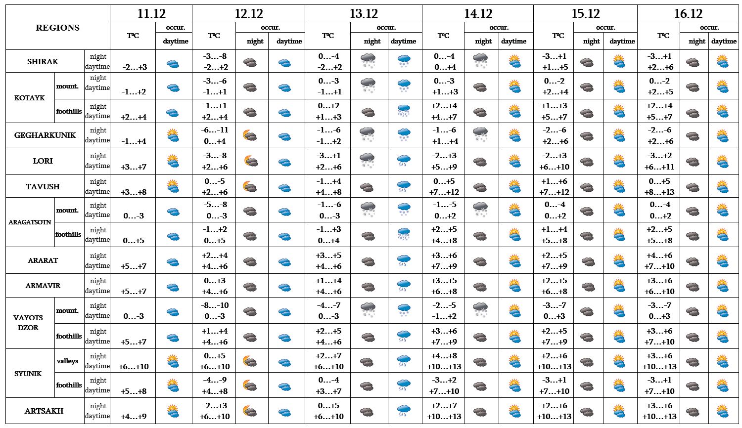 In the daytime of December 11, on 12, in the daytime of 14, on 15-16 no precipitation is predicted. At night of 13 and 14 in separate regions, in the daytime of December 13 in most regions precipitation is predicted, in mountainous regions in the form of snow. In the morning of December 11-12 in Ararat Valley, on 13-14 in most regions fog is predicted.