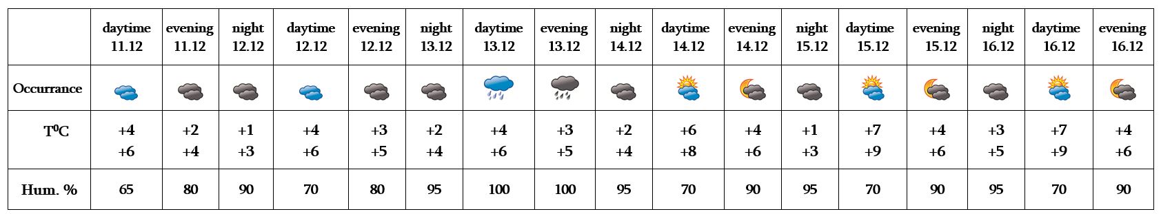 In the daytime of December 11, on 12, at night of 13, on 14-16 no precipitation is predicted. In the daytime of December 13 rain and fog is predicted.