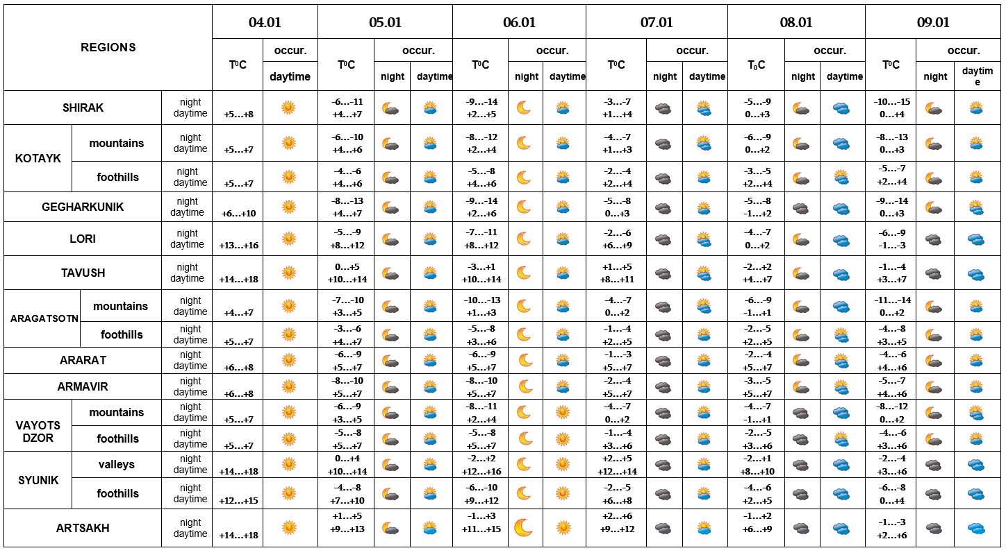In the daytime of January 5 in Lori, Tavush, Syunik provinces and in Artsakh the air temperature will go down by 3-5 degrees.