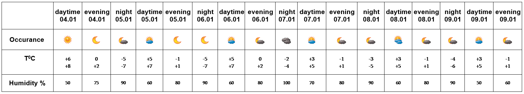 In the daytime of January 5, on 6-9 no precipitation is predicted.