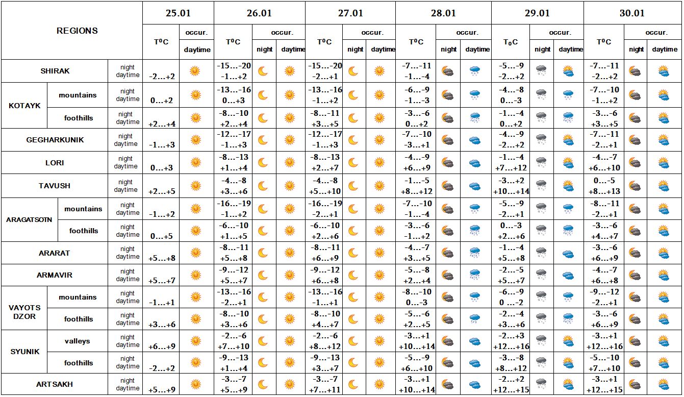 On Januray 26-29 the ari temperature in Lori, Tavush, Syunik provinces and Artsakh will gradually go up by 8-10 degrees.