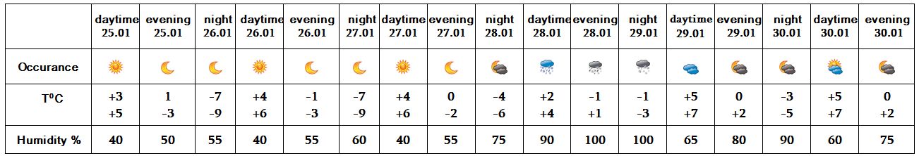 In the daytime of January 25, on 26-27, at night of 28, on 30 no precipitation is predicted. In the daytime of January 28, on 29 precipitation is predicted.