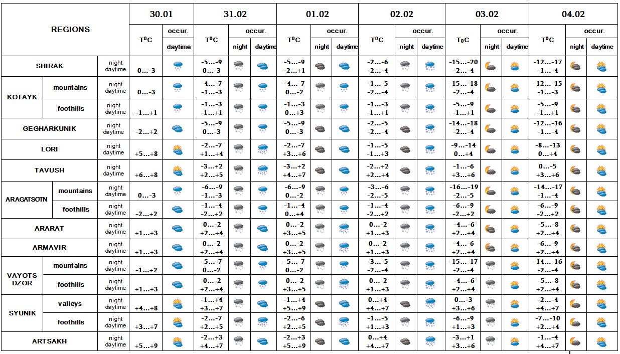 In the daytime of January 30, on 31, on February 1, at night of 3 in sparate regions, on 2 in most regions from time to time snow with fog is predicted.