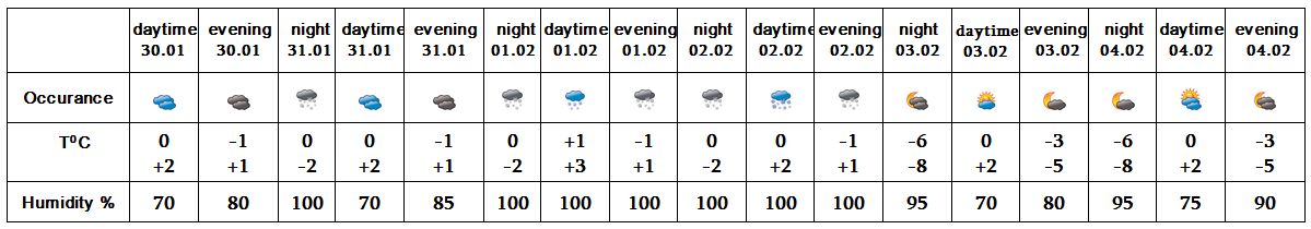 In the daytime of January 30, on 31, on February 1 light snow is predicted. On February 2 from time to time snow with fog is predicted. On February 3-4 on precipitation is predicted.
