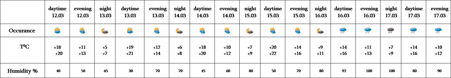 In the daytime of March 13, on 14-15 no precipitation is predicted. On March 16-17 rain is predicted.