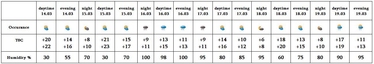 In the daytime of March 14, on 15, on 18 and at night of 19 no precipitation is predicted. On March 16, at night and in the morning of 17, in the daytime of 19 rain is predicted.