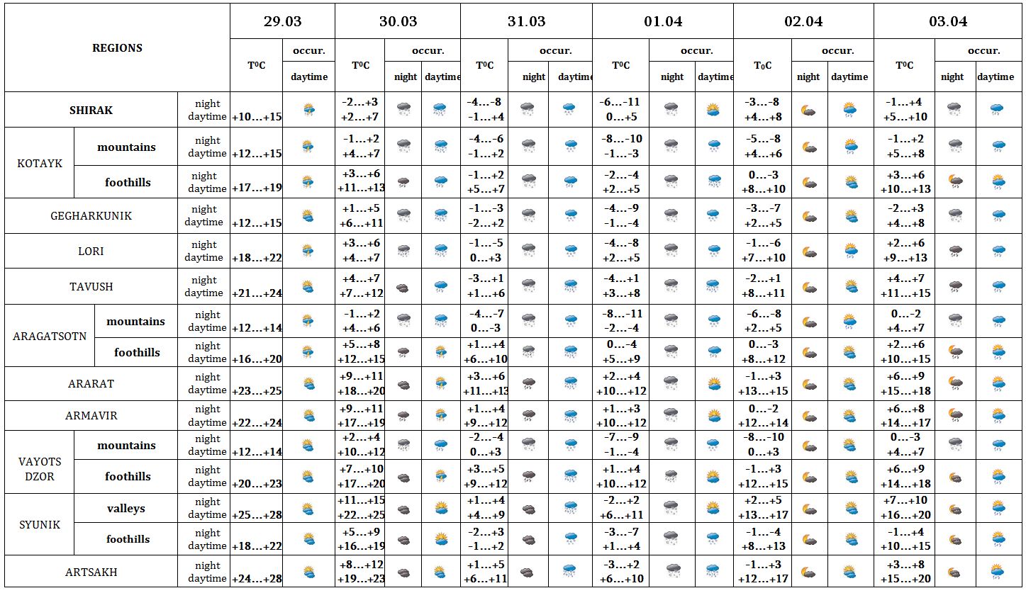 On March 29, in the daytime of April 1 and 2, on 3 in separate regions, on 30-31, at night of April 1 in some regions precipitation is predicted: on 30 in mountainous regions, on 31 and on April 1 in the mountainous and foothill regions in the form of snow. At night of April 2 no precipitation is predicted. Fog in separate places, on March 29-30 thunderstorms is possible.